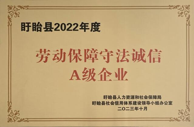 10月30日,江苏bw必威西汉姆联官方网站荣获由盱眙县人力资源和社会保障局、盱眙县社会信用体系建设领导小组办公室颁发的盱眙县2022年度劳动保障守法诚信A级企业荣誉称号。