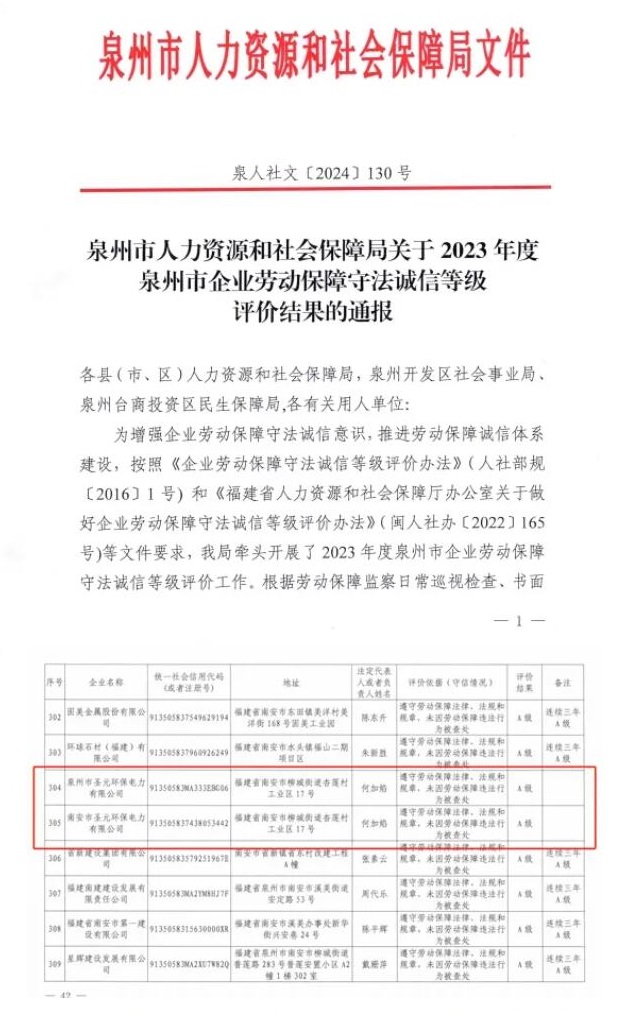 7月10日,泉州市人力资源和社会保障局印发关于2023 年度泉州市企业劳动保障守法诚信等级评价结果的通报,南安bw必威西汉姆联官方网站和泉州bw必威西汉姆联官方网站荣获“劳动保障守法诚信A级企业”称号。