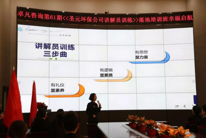朱煜煊董事长指出,环保宣导员是向公众展现企业形象的一扇窗,担负着宣传企业文化、传播环保理念的重要职责。希望全体学员要珍惜机会,充分利用七天的培训时间,争取学有所获,学以致用。并对学员们提出具体要求:一是加强心理素质训练。要抛弃私心杂念,敢于突破心理障碍,主动招呼,积极表达,通过自身行动去带动周边同事,营造出和谐温馨、乐于奉献的良好氛围;二是提升业务技能。集中精力虚心学,摒弃杂念安心学,切实增强宣导队伍的业务素质,积极推动环保设施向公众开放工作。