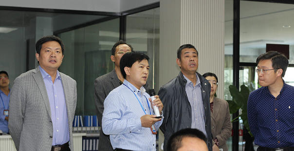 图为总经理李英杰向调研组详细介绍了公司运营概况。左三:华东督查主任高峰;左一:盱眙县副县长顾强